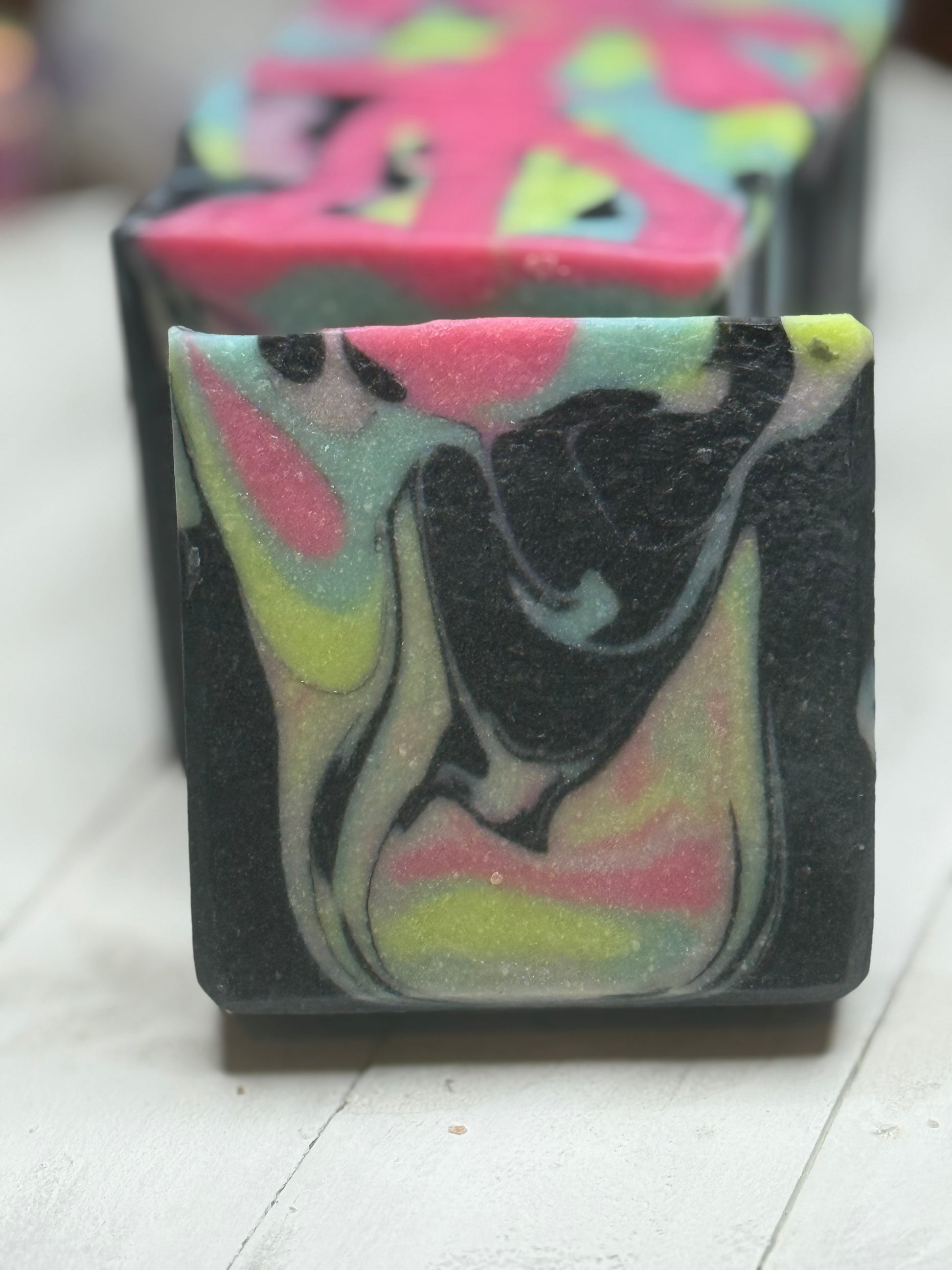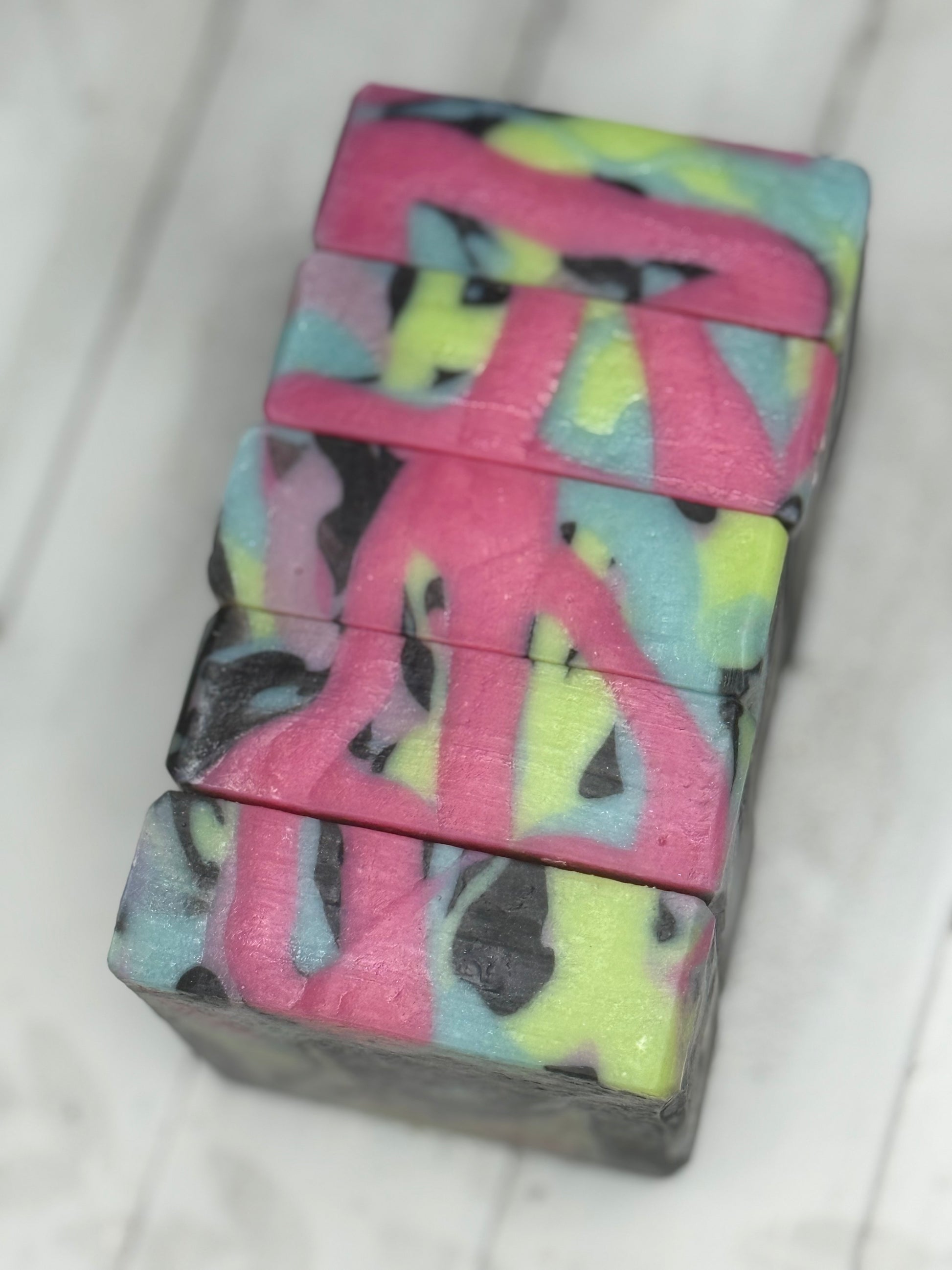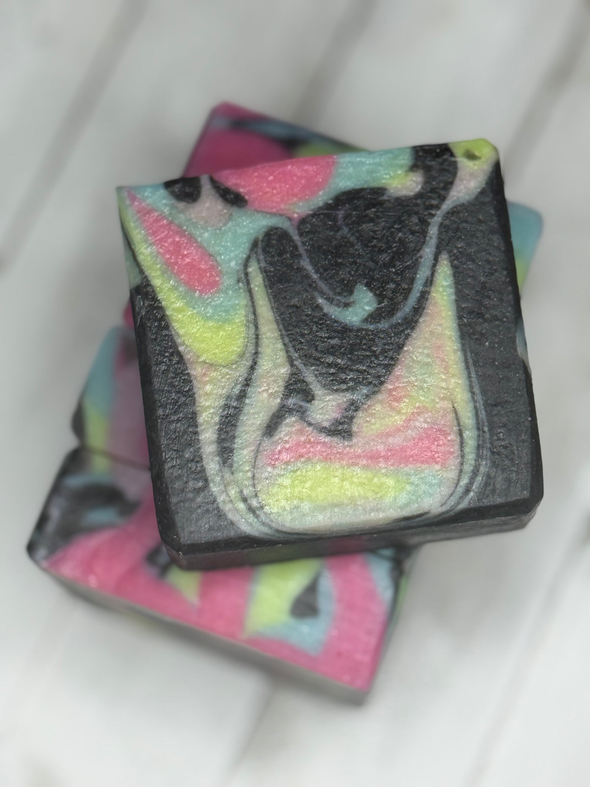 Take it back to the neon decade! Our 1985 bar combines detoxifying charcoal with bold pops of neon color for a soap that’s as eye-catching as it is skin-loving. Made with creamy goat milk, tallow, shea butter, and coconut oil, it leaves your skin feeling fresh, clean, and smooth.